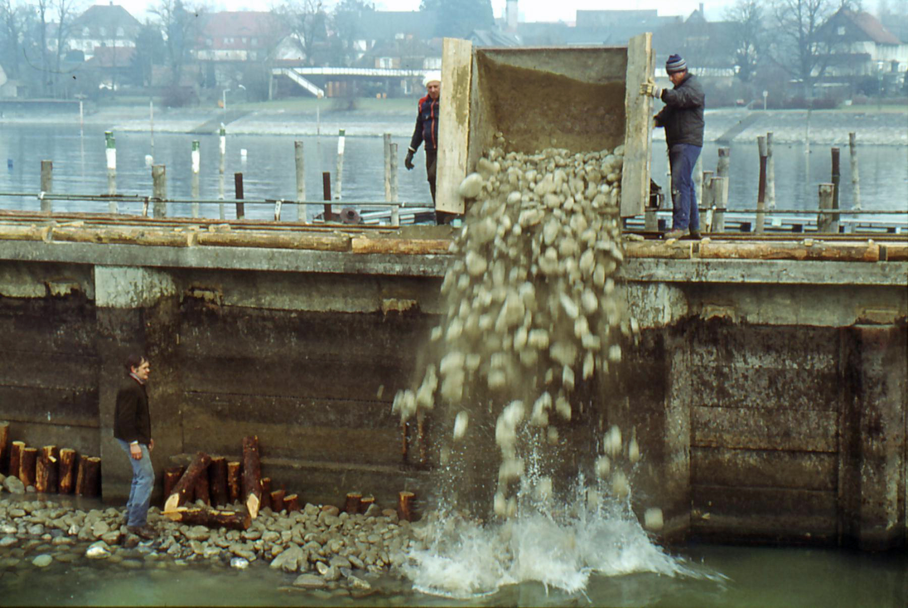 Beim nächsten Mal ging man es größer an: 1.100 Tonnen Steine wurden aus dem Tettnanger Wald angefahren und auf dem Landungssteg auf eine Lore umgeladen. Für die Lore hatten die Vereinsmitglieder extra Schienen auf der Quermole verlegt und das Geländer abmontiert. So konnten die Wacken direkt von der Mole in den See gekippt werden. Aber auch diese Steine verschwanden. Relative Ruhe gab es erst, nachdem große, eckige Flussbausteine vom See aus verlegt wurden, die sich selbst verkanten und die Mole schützen können.