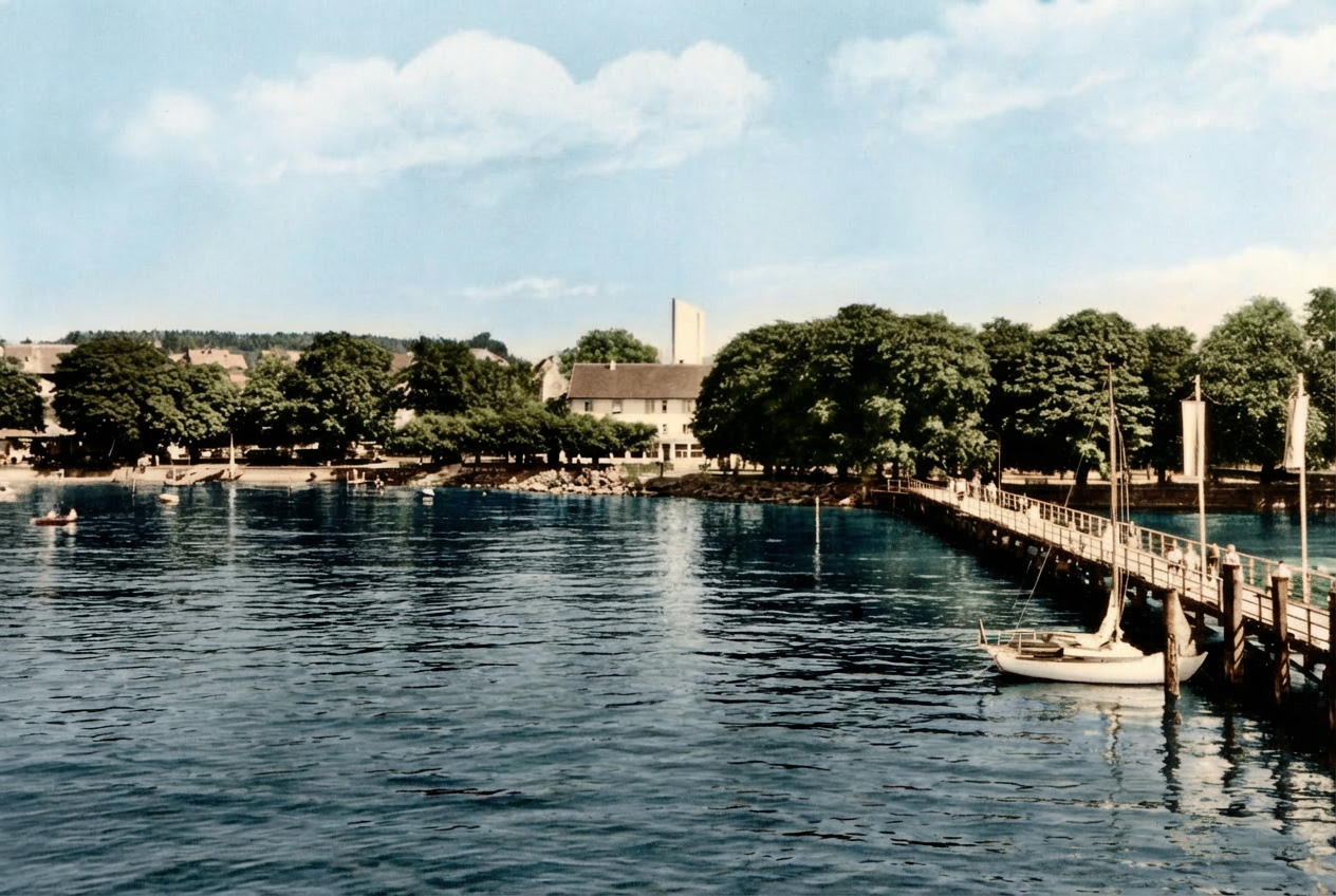 Doch von Anfang an: Auf einer Postkarte von 1962 sieht man, dass man noch nichts sieht… vom heutigen Hafen. Segelboote machten irgendwie am hölzernen Landungssteg der Linienschifffahrt fest. Erst als der Steg nach der Seegfrörne 1963 so marode war, dass er ersetzt werden musste, sollte eine Hafenanlage gleich mit gebaut werden. Die Gemeinde Nonnenhorn zahlte, auch damit der neue Anlegesteg doppelt so breit würde wie der alte – zum Flanieren für Einheimische und Urlaubsgäste. Im Mai 1965 wurde der neue Beton-Landungssteg mit einer rechtwinklig angesetzten Quermole als Hafenmauer eingeweiht. „Eine der modernsten Wasseranlagen am Bodensee“, hieß es damals in der „Lindauer Zeitung“. Doch die neue Quermole hielt nach der Einweihung nur genau 41 Tage. Ein Sturm bei Hochwasser an Fronleichnam riss den mittleren Teil der Mole weg.